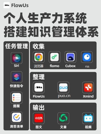 FlowUs 投稿的这张 App 工具组合图,就是解决知识管理的全流程问题,额外还有任务管理