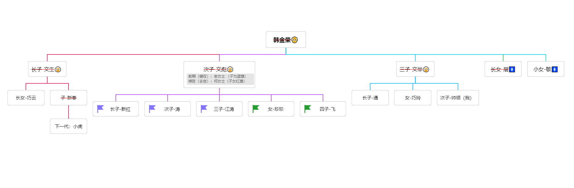 二大爷(韩姓)—— 安女士(离)—— 何女士(续弦)